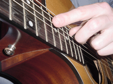 fleshy part of the bottom of your fret hand index finger directly over the fretboard (as opposed to placing your fingers firmly on the fretboard